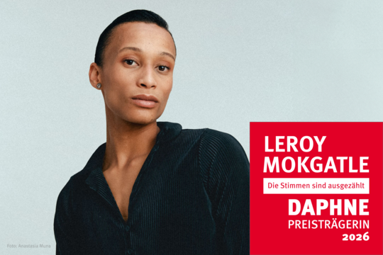 Leroy Mokgatle heißt die Daphne-Preisträgerin 2026 der TheaterGemeinde Berlin. Die 25-jährige Tänzerin aus dem Ensemble des Staatsballetts Berlin erhielt mit 41 Prozent die deutliche Mehrheit der abgegebenen Stimmen und geht somit als Siegerin aus der Wahl hervor. Den zweiten Platz mit 34 Prozent belegt die Schauspielerin Maeve Metelka (Berliner Ensemble), gefolgt von der Schauspielerin Lorena Handschin (Deutsches Theater Berlin) mit 25 Prozent. Die Preisverleihung findet voraussichtlich im Frühjahr 2026 statt, den genauen Termin geben wir baldmöglichst bekannt.